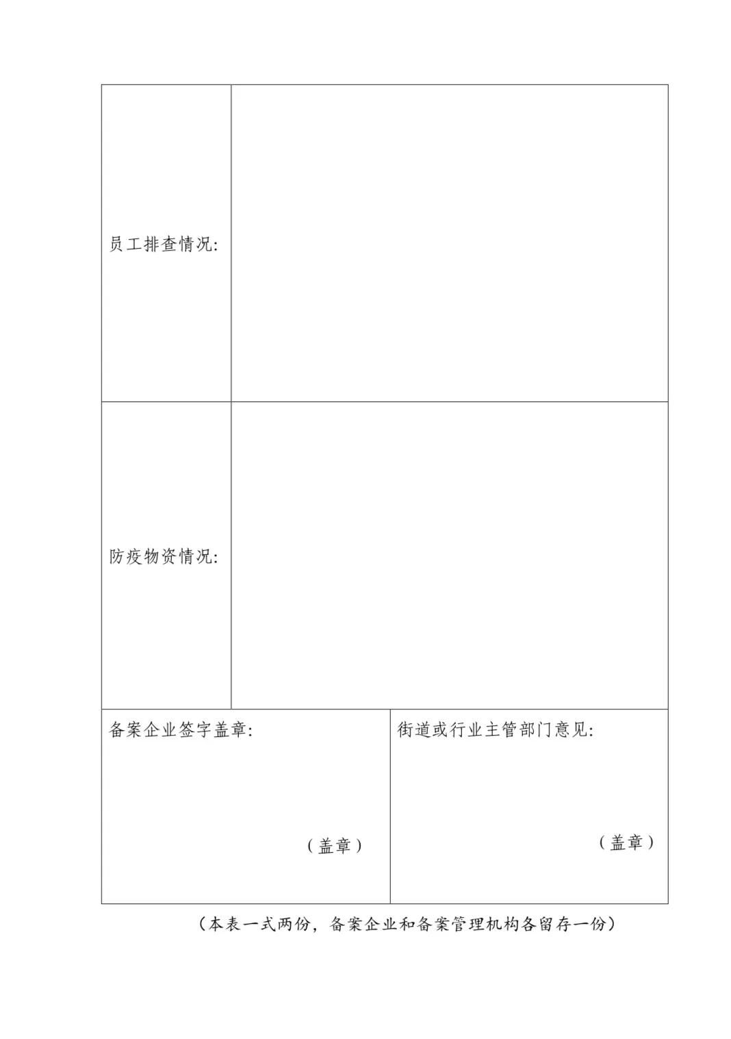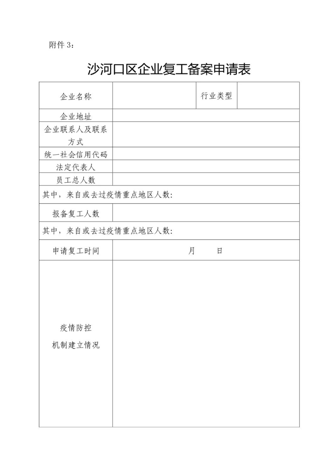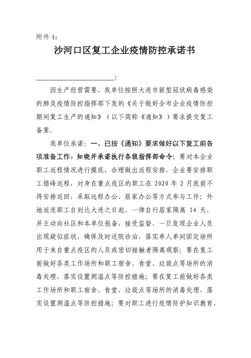 沙河口区关于做好疫情防控期间 企业复工生产工作的通知 各有关企业: 按照《辽宁省新型冠状病毒感染的肺炎疫情防控指挥部5号令》和大连市新型冠状病毒感染的肺炎疫情防控指挥部《关于做好大连市企业疫情防控期间复工生产的通知》(以下简称《通知》)要求,现就企业复工相关工作通知如下: 1.企业复工需严格落实《通知》要求,满足相关规定条件方可复工。企业对本企业复工生产和疫情防控工作负主体责任,必须确保复工生产不导致疫情传播。企业法人代表是本企业疫情防控第一责任人。 2.复工企业(按省、市要求暂缓复工的企业及暂停开放的场所除外)在开工前,需按复工员工规模分级向属地街道或行业主管部门备案。企业复工备案管理具体流程如下: (1)企业在做好《通知》中关于企业复工前所需各项准备工作前提下,参照大连市工业和信息化局推荐的《企业复工疫情防控参考指南》的相关指导意见,做好疫情防控工作。企业复工员工人数低于100人的,向属地街道提出备案申请;复工员工人数在100人以上(含100人)的向所属行业主管部门提出复工备案申请。 (2)企业复工备案所需材料:①沙河口区企业复工备案申请表(附件3);②沙河口区复工企业疫情防控承诺书(附件4);③复工企业疫情防控工作方案、工作制度(可参考附件1、附件2)。 3.实行企业复工情况“日报告”制度。复工企业在复工生产的前一个月内(暂定),每日下午2点前将《企业重大事项报告表》(附件5)上报备案机关。 4.企业组织每一名复工职工如实填写《职工复工登记表》(附件6),掌握职工个人及家庭、亲友的疫情相关信息,发现异常情况要按规定立即采取必要措施并向所备案机关报告。 5.如国家、省、市出台疫情防控期间企业复工工作新要求,以国家、省、市新要求为准。 附件:1.《关于做好全市企业疫情防控期间复工生产的通知》 2.《关于推荐<企业复工疫情防控参考指南>的通知》 3.《沙河口区企业复工备案申请表》 4.《沙河口区复工企业疫情防控承诺书》 5.《企业重大事项报告表》 6.《职工复工登记表》 沙河口区新型冠状病毒感染的肺炎 疫情防控指挥部办公室 2020年2月8日